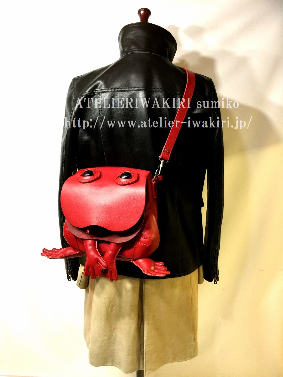 赤いカエルバッグ↓の手首についているオタマジャクシは撮影用です。実物にはついていません。